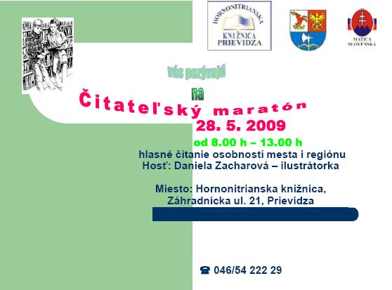 Pozvánka do Hornonitrianskej knižnice v Prievidzi na čitateľský maratón, 28. 5. 2009 od 8.00 do 13.00 hod.