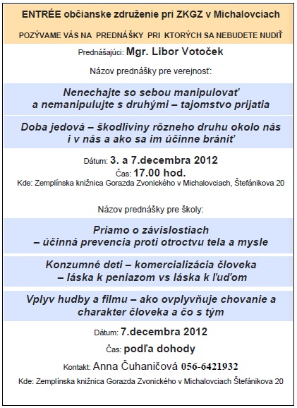 Pozvánka na zaujímavé prednášky do Zemplínskej knižnice Gorazda Zvonického v Michalovciach, 3. a 7. 12. 2012. Prednášky sú určené pre verejnosť a pre školy.