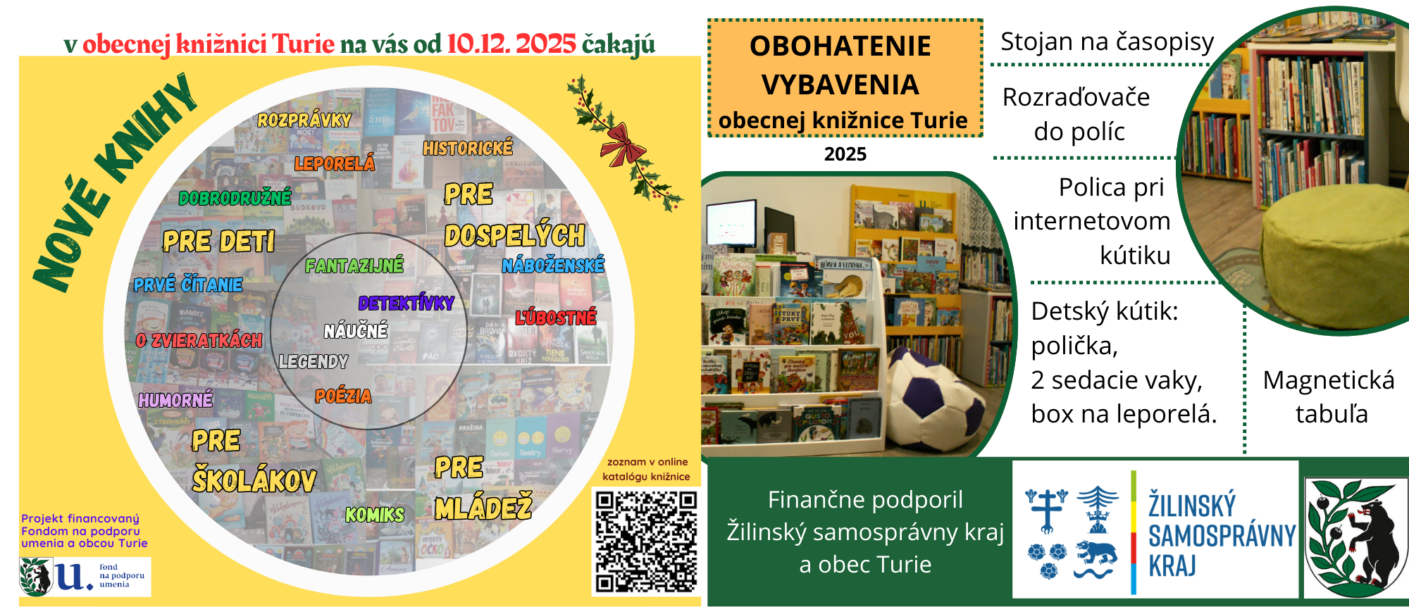 Obohatenie vybavenia obecnej knižnice Turie bolo podporené Žilinským samosprávnym krajom. V knižnici pribudli dve poličky využité na knihy pre začínajúcich samostatných čitateľov a náučnú literatúru pre deti, box na leporelá a dva sedacie vaky do detského kútika. Pre lepší prehľad v knižnici pribudol stojan na časopisy a rozraďovače do regálov. Pre rôzne využitie na podujatiach poslúži magnetická tabuľa. Cez projekt knižnica získala na nákup zariadenia sumu 900,- €.