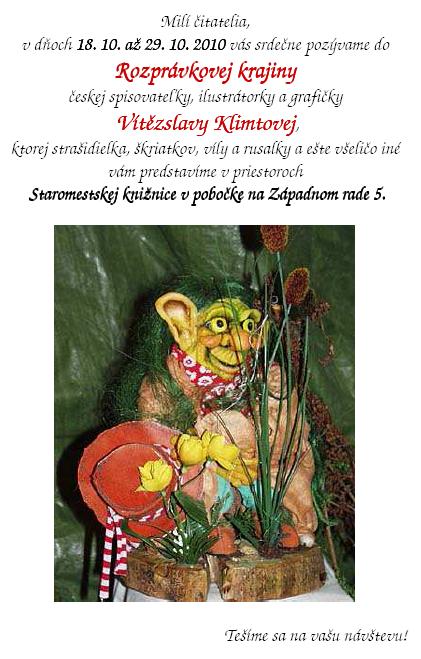 Pozývame Vás na slávnostné otvorenie výstavy Rozprávková krajina Vítìzslavy Klimtovej 19. 10. 2010 o 10,00 hod. do Staromestskej knižnice, pobočka Západný rad 5.