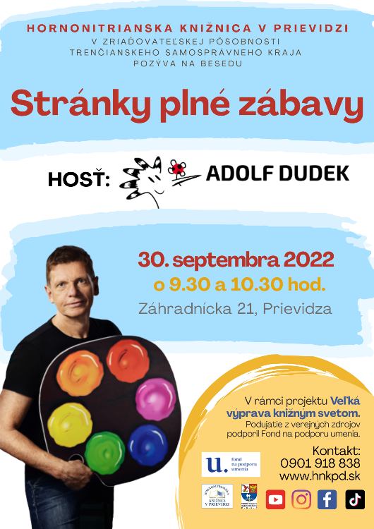 Vzácny človek, český ilustrátor Adolf Dudek, ktorého knihy si prečítali viac ako 3 milióny malých čitateľov prinesie radosť a dobrú náladu aj k nám 30.9.2022 o 9.30 a 10.30 hod. Tešíme sa na účastníkov s dobrou náladou v knižnici na Záhradníckej ulici 21 v Prievidzi.