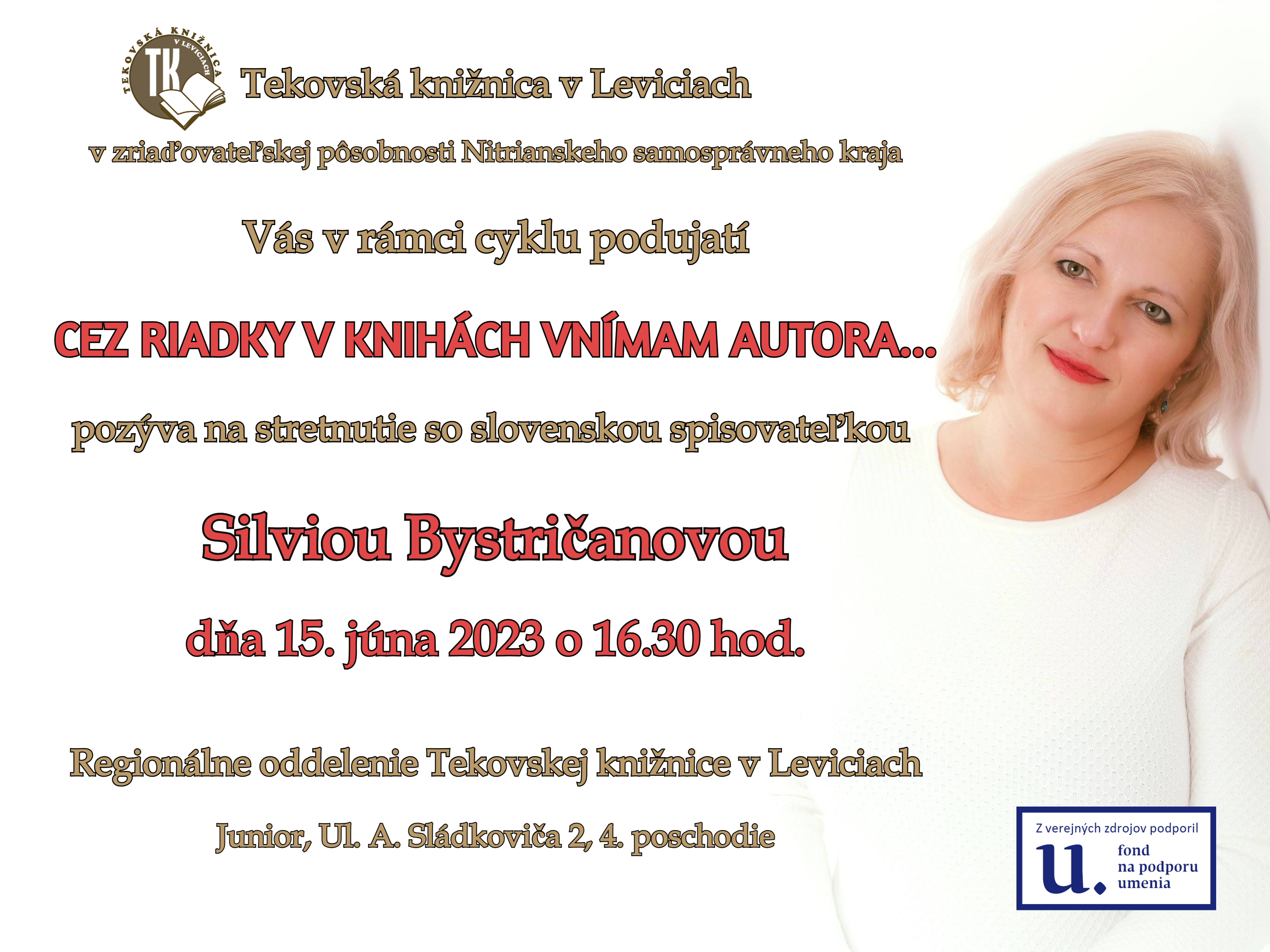 V rámci pripravovaného cyklu podujatí CEZ RIADKY V KNIHÁCH VNÍMAM AUTORA... organizuje Tekovská knižnica v Leviciach stretnutie so slovenskou spisovateľkou Silviou Bystričanovou.