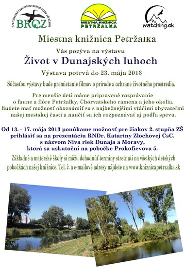 | Popis: | Miestna knižnica Petržalka Vás srdečne pozýva na výstavu Život v Dunajských luhoch. Súčasťou výstavy bude premietanie filmov o prírode a ochrane životného prostredia. Pre menšie deti máme pripravené rozprávanie o faune a flóre Petržalky, Chorvátskeho ramena a jeho okolia. Budete mať možnosť oboznámiť sa s najbežnejšími vtáčími obyvateľmi našej mestskej časti a naučiť sa ich rozpoznávať podľa spevu. Od 13. – 17. mája 2013 ponúkame možnosť pre žiakov 2. stupňa ZŠ prihlásiť sa na prezentáciu RNDr. Kataríny Zlochovej CSc. s názvom Niva riek Dunaja a Moravy, ktorá sa uskutoční na pobočke Prokofievova 5. Základné a materské školy si môžu dohodnúť termíny stretnutí na všetkých detských pobočkách našej knižnice. Tel. č. a e-mailové adresy nájdete na www.kniznicapetrzalka.sk |